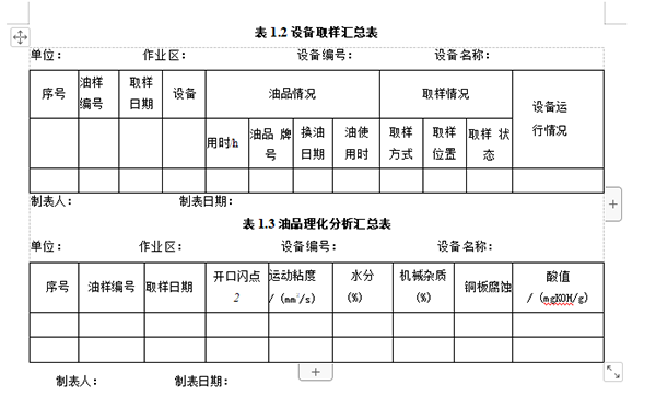 為了便于傳遞信息,對各類數(shù)據(jù)進(jìn)行對比和匯總分析,需要生成各類報(bào)表, 以備分析需要選擇。生成的報(bào)表可包括:①油液報(bào)表,包括油樣明細(xì)表、單機(jī) 取樣記錄匯總表、油樣月度匯總表等;②油品理化分析報(bào)表,包括油樣分析結(jié) 果表、單機(jī)潤滑理化分析匯總表、單臺設(shè)備潤滑記錄表等;③鐵譜分析結(jié)果表, 包括磨粒成分匯總表、磨粒濃度數(shù)據(jù)匯總表、鐵譜分析記錄表等;④油液監(jiān)測 結(jié)論表等。下面給出了 “設(shè)備取樣匯總表”和“油品理化分析匯總表”的樣表, 見表1.1和表1.3。